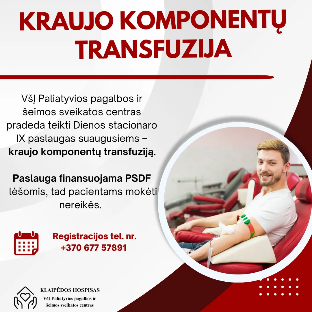 Džiaugiamės galėdami pranešti, kad VšĮ Paliatyvios pagalbos ir šeimos sveikatos centras išplėtė savo paslaugų spektrą ir pradėjo teikti Dienos stacionaro IX kraujo komponentų transfuzijos paslaugas suaugusiems pacientams.